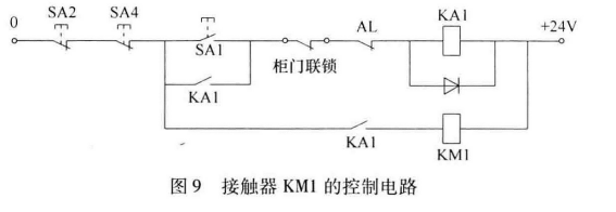 1.數(shù)控系統(tǒng)所用的-200V電源,是經(jīng)過接觸器KM1的觸點加入的。接觸器KM1的控制電路如圖9所示。24V控制電源經(jīng)急停按鈕SA2和SA4、起動按鈕SA1(或自鎖觸點KA1)、柜門聯(lián)鎖開關(guān)、觸點AL加到繼電器KA1上,KAl吸合后,KM1通電,接通數(shù)控系統(tǒng)的電源